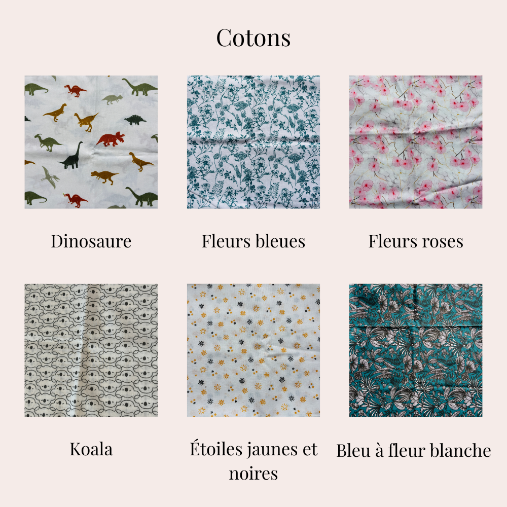 Dinosaure, Fleurs bleues, Fleurs roses, Koala, Étoiles jaunes et noires, Bleu à fleur blanche