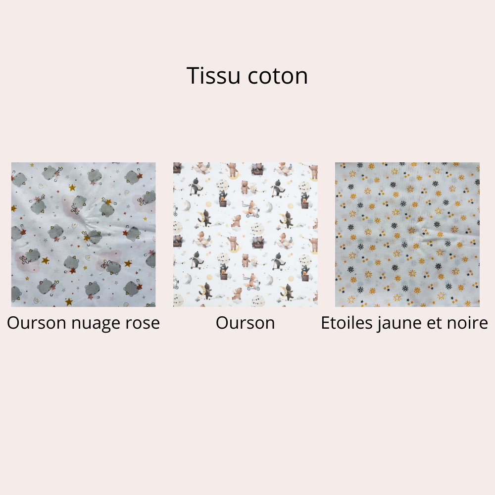 • Matières nobles et saines : Pour respecter la peau fragile de votre tout-petit, j’utilise uniquement des tissus certifiés.
